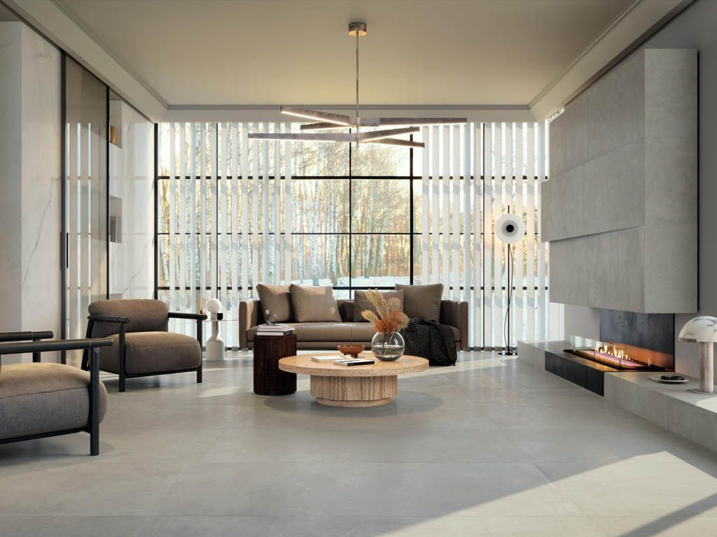 Крупноформатное решение (80×160 см) для современных интерьеров в стиле минимализма, лофта, скандинавского и индустриального дизайна. Матовая натуральная поверхность в оттенке «слоновая кость» (Ivory) с имитацией текстуры бетона или цемента выглядит элегантно и сочетается с деревом, металлом и стеклом. Ректифицированные края позволяют уложить плитку с минимальными швами — создаётся эффект цельного покрытия.
